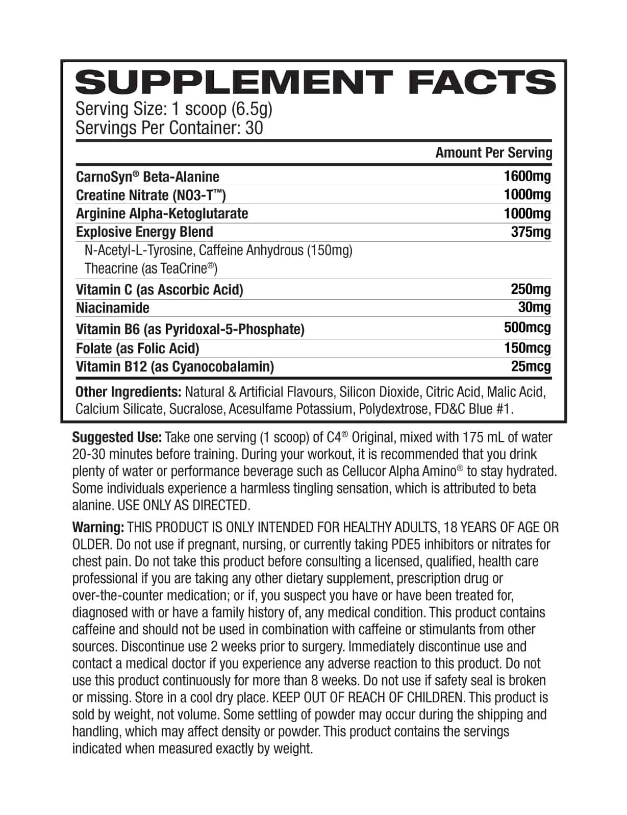 C4 Original offre pas moins de 9 ingrédients, passant par les Vitamines C, B6, B12, Acides Folique, Carnosyn®, l’éternelle créatine monohydrate que l’on retrouve dans quasi tous les booster qui existent, de l’arginine, de la Tyrosine et la caféine que l’on oublie jamais !